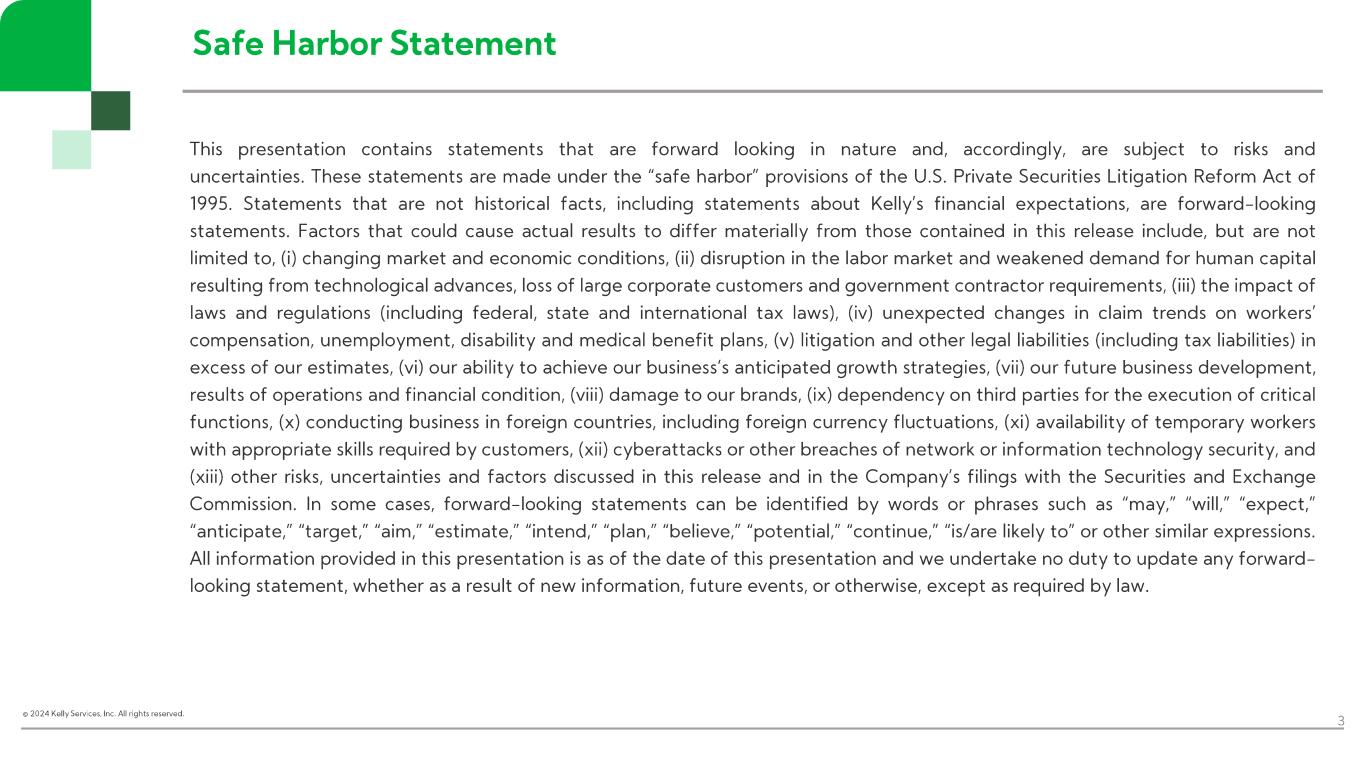 This release contains statements that are forward looking in nature and, accordingly, are subject to risks and uncertainties. These statements are made under the “safe harbor” provisions of the U.S. Private Securities Litigation Reform Act of 1995. Statements that are not historical facts, including statements about Kelly’s financial expectations, are forward-looking statements. Factors that could cause actual results to differ materially from those contained in this release include, but are not limited to, (i) changing market and economic conditions, (ii) disruption in the labor market and weakened demand for human capital resulting from technological advances, loss of large corporate customers and government contractor requirements, (iii) the impact of laws and regulations (including federal, state and international tax laws), (iv) unexpected changes in claim trends on workers’ compensation, unemployment, disability and medical benefit plans, (v) litigation and other legal liabilities (including tax liabilities) in excess of our estimates, (vi) our ability to achieve our business’s anticipated growth strategies, (vii) our future business development, results of operations and financial condition, (viii) damage to our brands, (ix) dependency on second parties for the execution of critical functions, (x) conducting business in foreign countries, including foreign currency fluctuations, (xi) availability of temporary workers with appropriate skills required by customers, (xii) cyberattacks or other breaches of network or information technology security, and (xiii) other risks, uncertainties and factors discussed in this release and in the Company’s filings with the Securities and Exchange Commission. In some cases, forward-looking statements can be identified by words or phrases such as “may,” “will,” “expect,” “anticipate,” “target,” “aim,” “estimate,” “intend,” “plan,” “believe,” “potential,” “continue,” “is/are likely to” or other similar expressions. All information provided in this press release is as of the date of this press release and we undertake no duty to update any forward-looking statement, whether as a result of new information, future events, or otherwise, except as required by law.