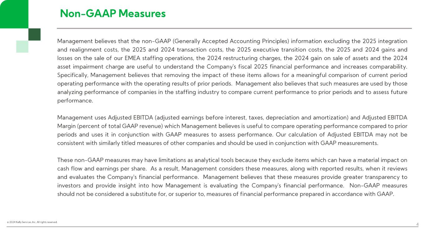 Management believes that the non-GAAP (Generally Accepted Accounting Principles) information excluding the 2025 integration and realignment costs, the 2025 and 2024 transaction costs, the 2025 executive transition costs, the 2025 and 2024 gains and losses on the sale of our EMEA staffing operations, the 2024 gain on forward contract, and the 2024 restructuring charges are useful to understand the Company's fiscal 2025 financial performance and increases comparability. Specifically, Management believes that removing the impact of these items allows for a meaningful comparison of current period operating performance with the operating results of prior periods. Management also believes that such measures are used by those analyzing performance of companies in the staffing industry to compare current performance to prior periods and to assess future performance.