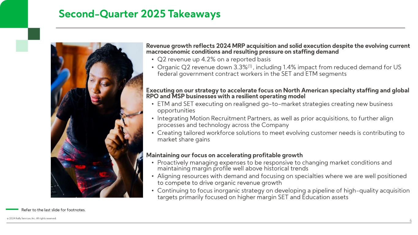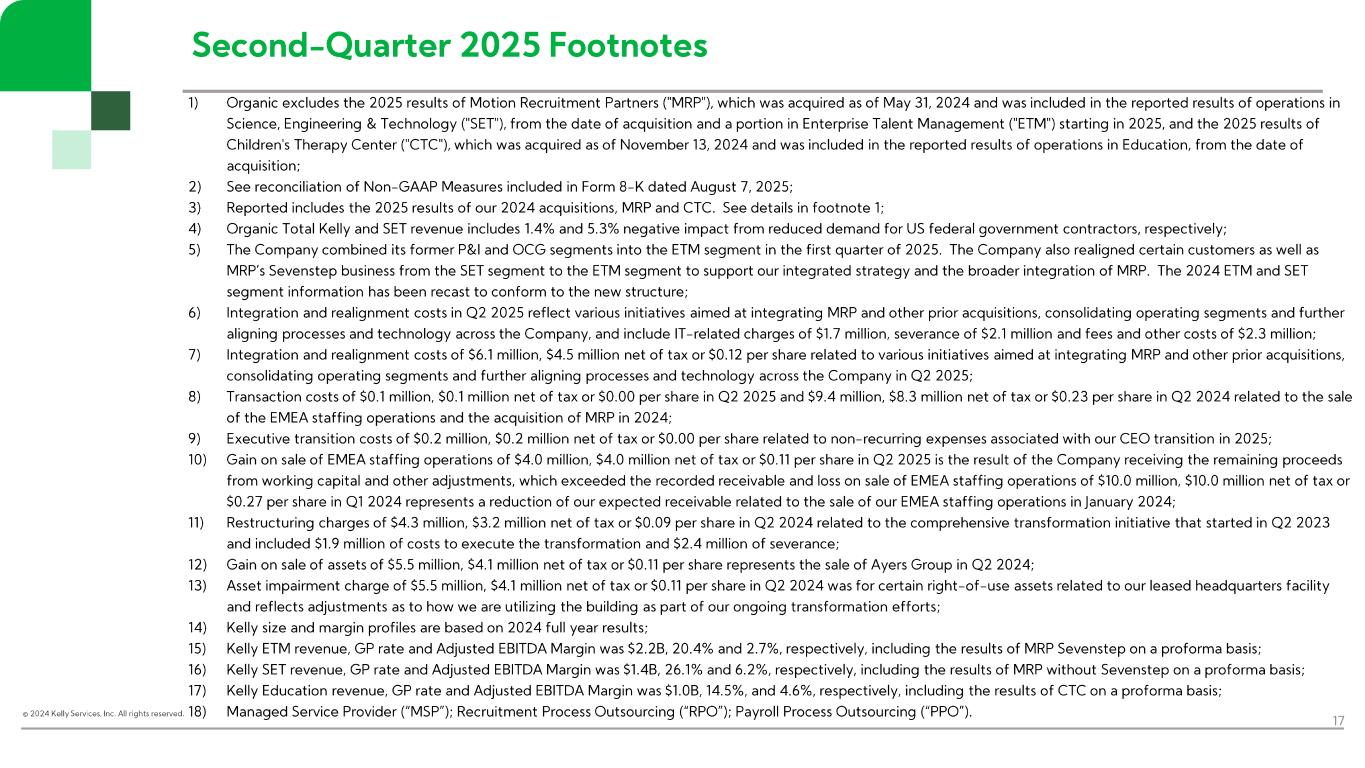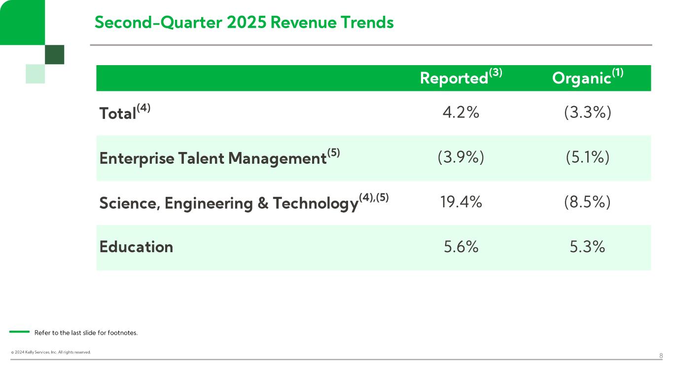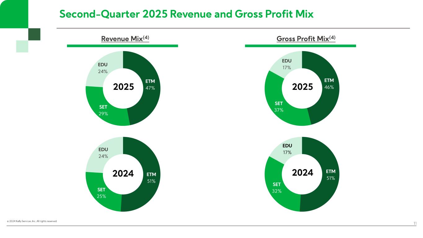“In the second quarter, Kelly continued to drive growth in more resilient markets, including K-12 staffing in our Education business, telecom and engineering solutions in SET, and payroll process outsourcing in ETM. Across the business, particularly in areas where customers are taking a more measured approach to hiring, we maintained our focus on aligning resource levels with demand,” said Peter Quigley, president and chief executive officer. “Our results reflect our commitment to staying close to our customers and creating opportunities in the current operating environment. By meeting employers’ evolving needs and executing on our efficiency and growth initiatives, we’ll continue to deliver near-term results while positioning Kelly for the future.”