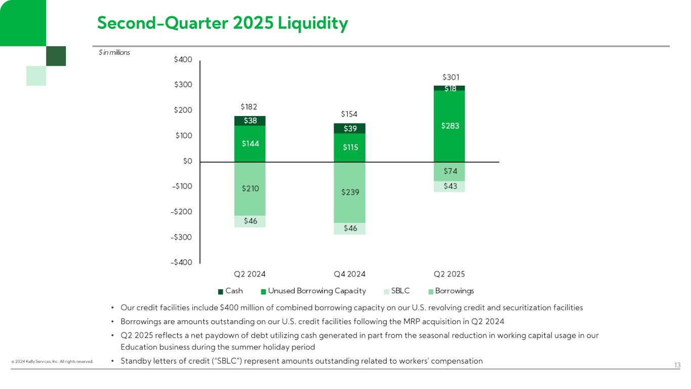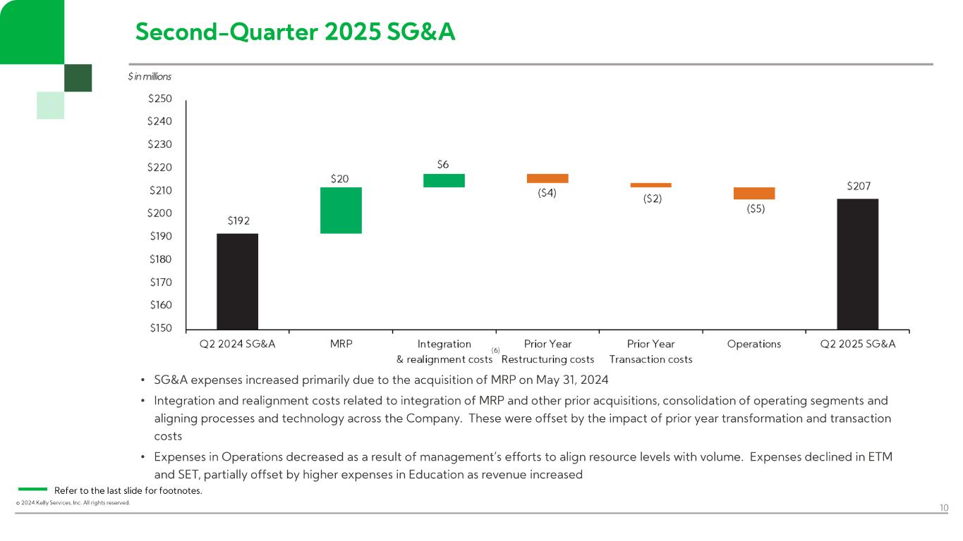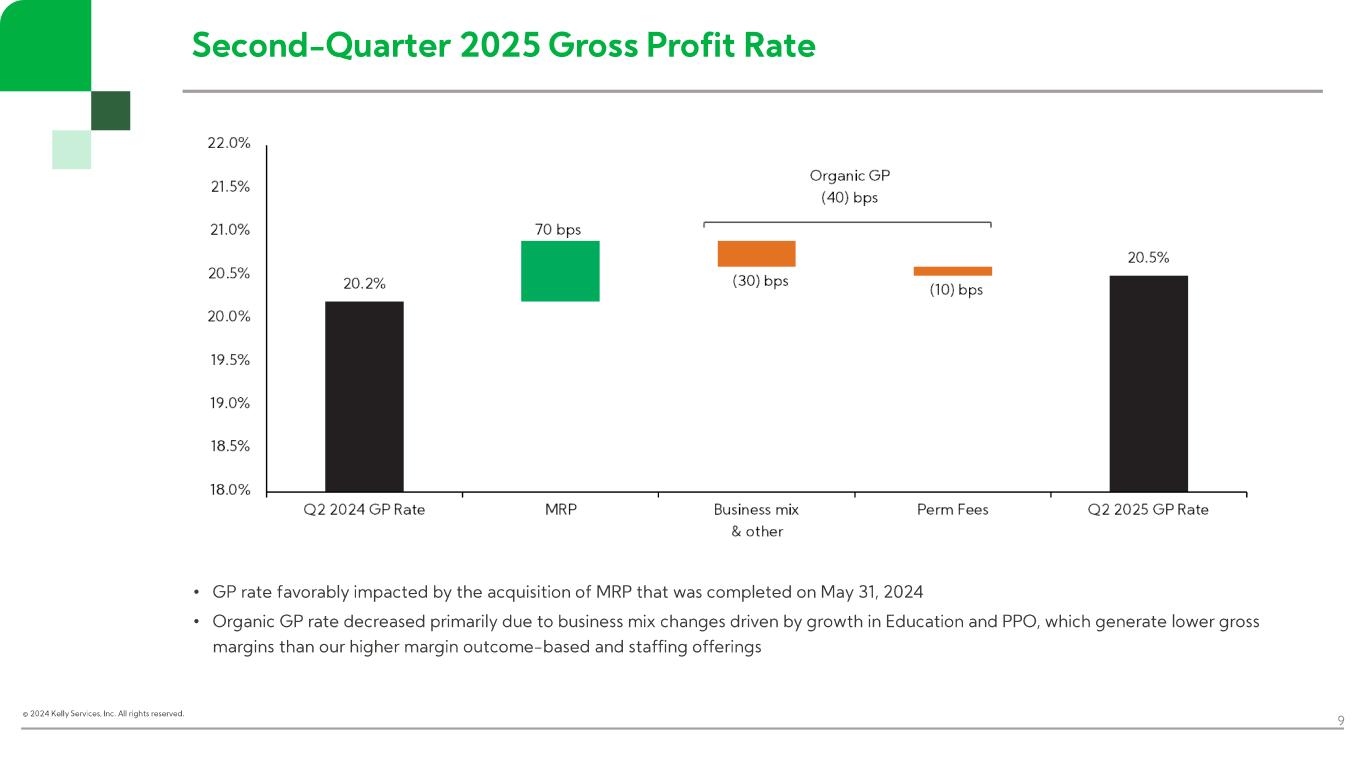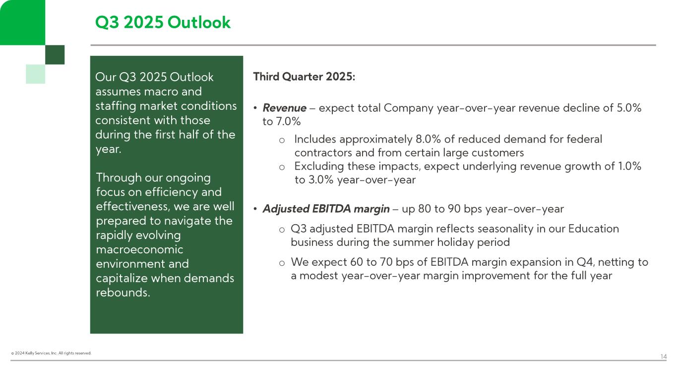 “In the second quarter, Kelly continued to drive growth in more resilient markets, including K-12 staffing in our Education business, telecom and engineering solutions in SET, and payroll process outsourcing in ETM. Across the business, particularly in areas where customers are taking a more measured approach to hiring, we maintained our focus on aligning resource levels with demand,” said Peter Quigley, president and chief executive officer. “Our results reflect our commitment to staying close to our customers and creating opportunities in the current operating environment. By meeting employers’ evolving needs and executing on our efficiency and growth initiatives, we’ll continue to deliver near-term results while positioning Kelly for the future.”